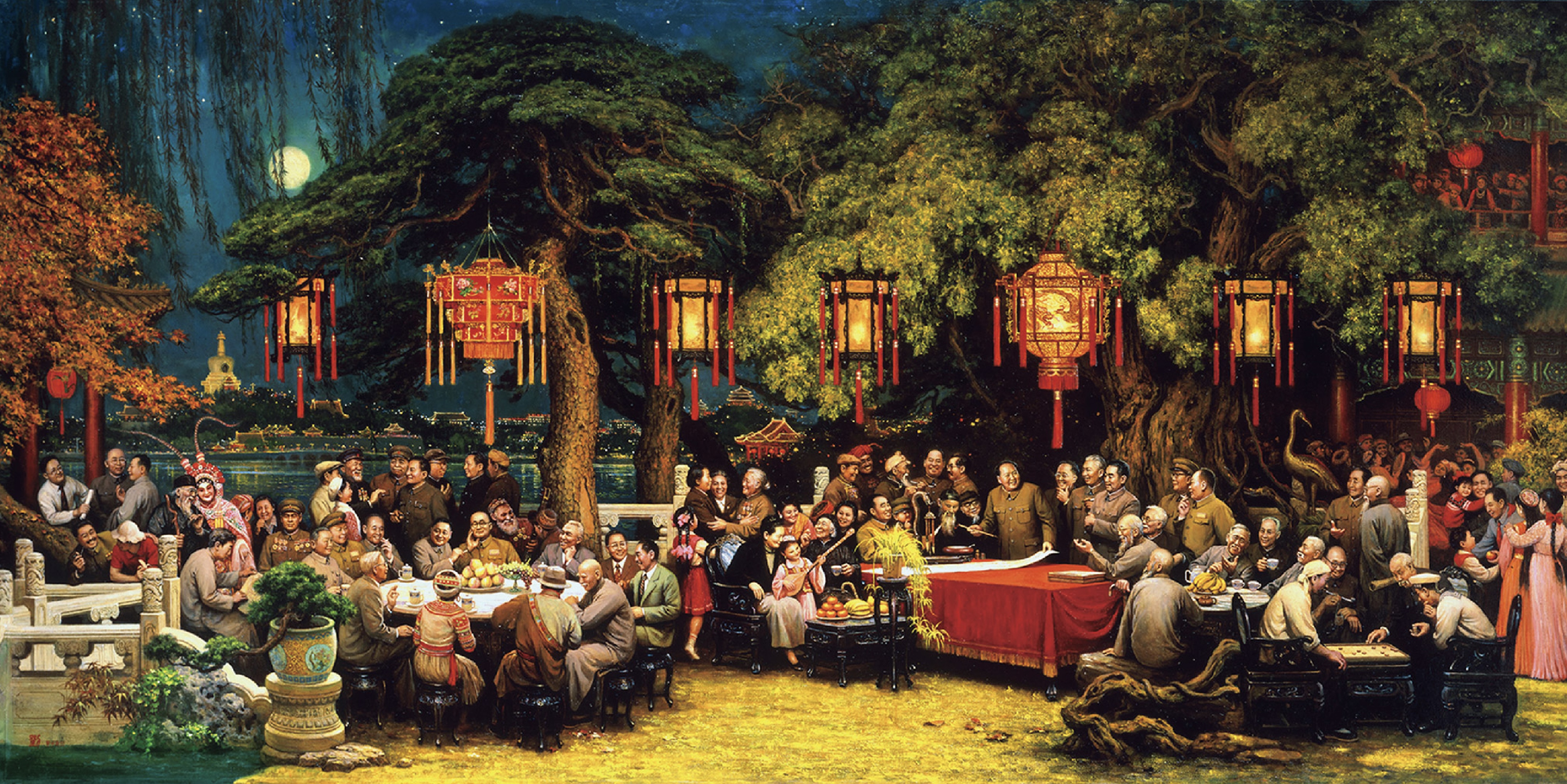 秋风拂面、丹桂飘香,合家团聚、花好圆月。此次特展的举办正直中秋佳节之际,各界名人名流都齐聚一堂,交谈甚欢、相互道贺,呈现出一派喜气洋洋、朝气蓬勃的热闹景象,此景恰好与刘宇一教授所创作的著名油画作品《良宵》的场景相交呼应。刘宇一教授根据1950年10月3日毛泽东主席和众多民主党派代表以及爱国人士在中南海欢聚一堂的场景,创作了油画作品《良宵》,生动地再现了新中国成立后的第一个中秋之夜,党和国家领导人、民主党派人士及群众代表共庆中秋夜的祥和景象,展现了党和国家蒸蒸日上、民族团结和睦、人民幸福安康的美好图景。