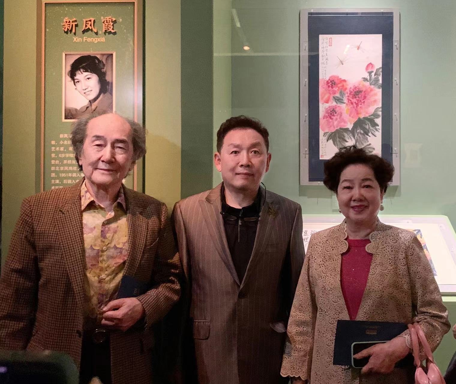 刘宇一夫妇与"百年巨匠"之一新凤霞先生之子吴欢在他母亲的专栏前合影留念。
